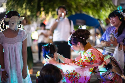 専用のワイヤレスヘッドホンと動物のお面をつけてみんなで踊る、周りから見ると無音の盆踊り。